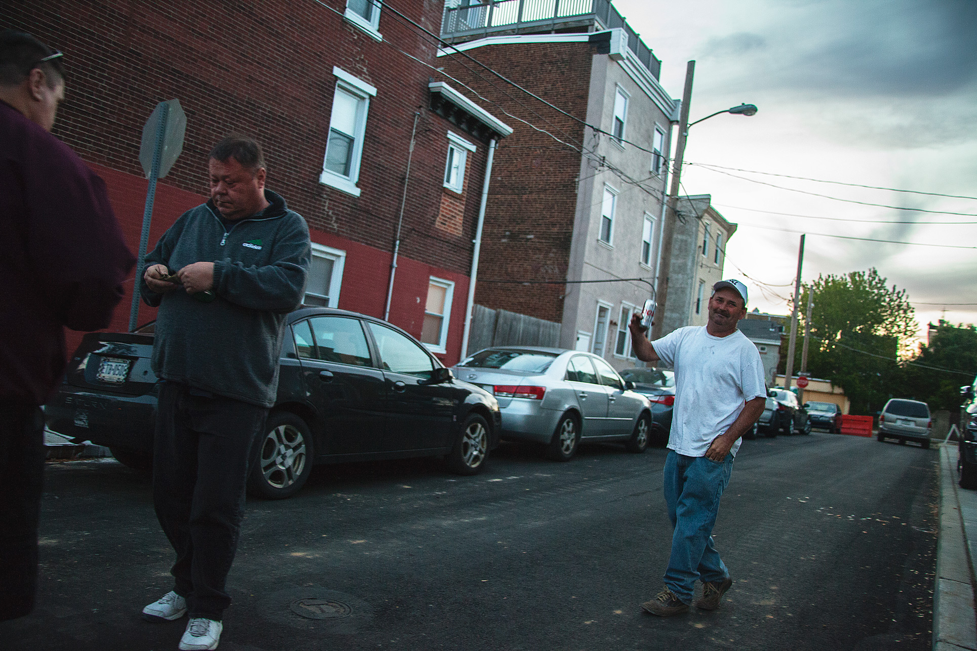 Pat Gallagher (left) and Eddie White (right) donate money to The Duffy String Band during their parade through Fishtown on May 21st, 2015.