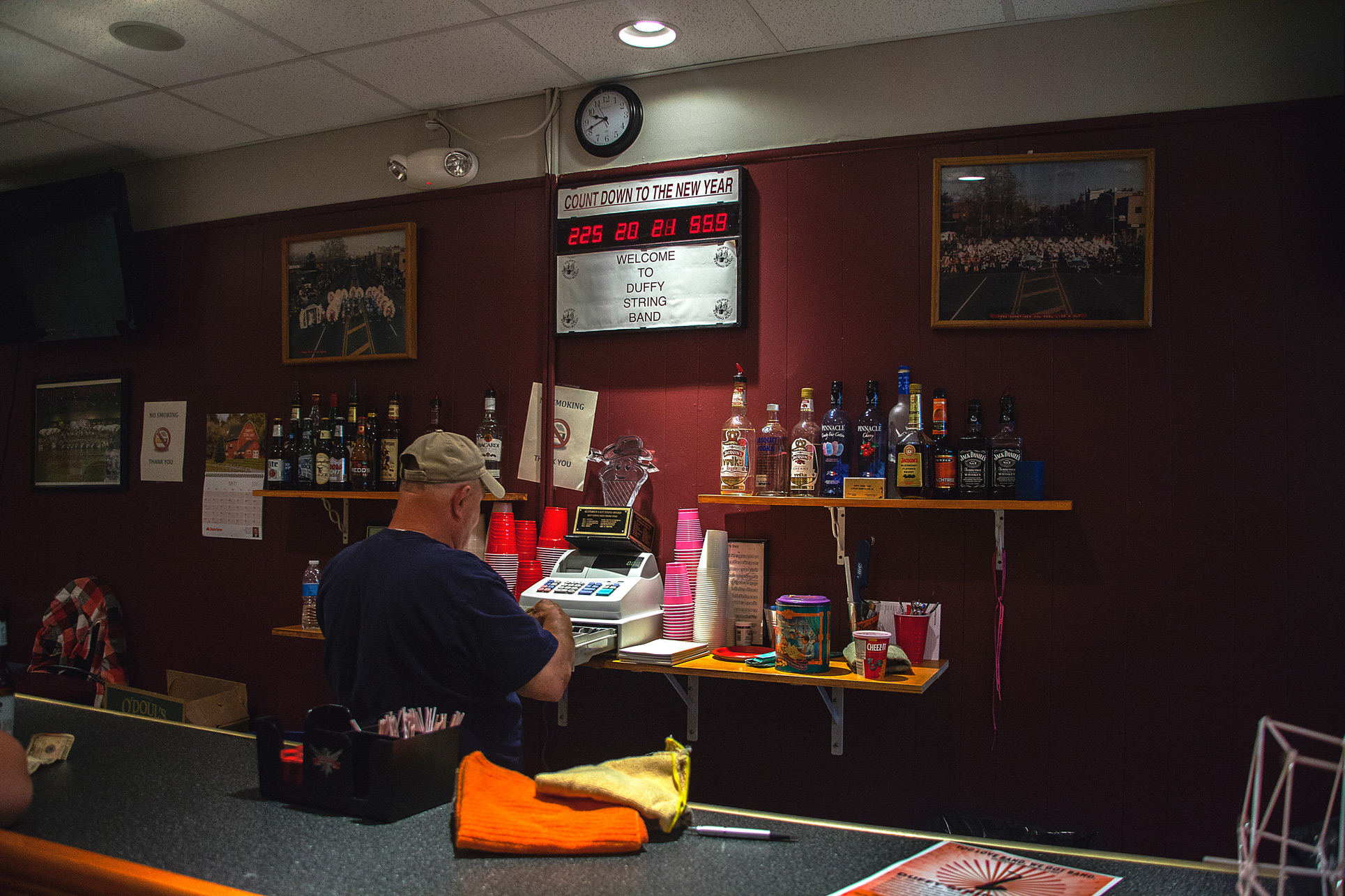 Mr. Ovecka rings up drinks under the “Count Down To The New Year” Clock at The Duffy String Band Headquarters on May 21st, 2015.