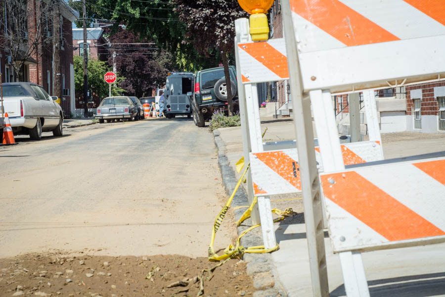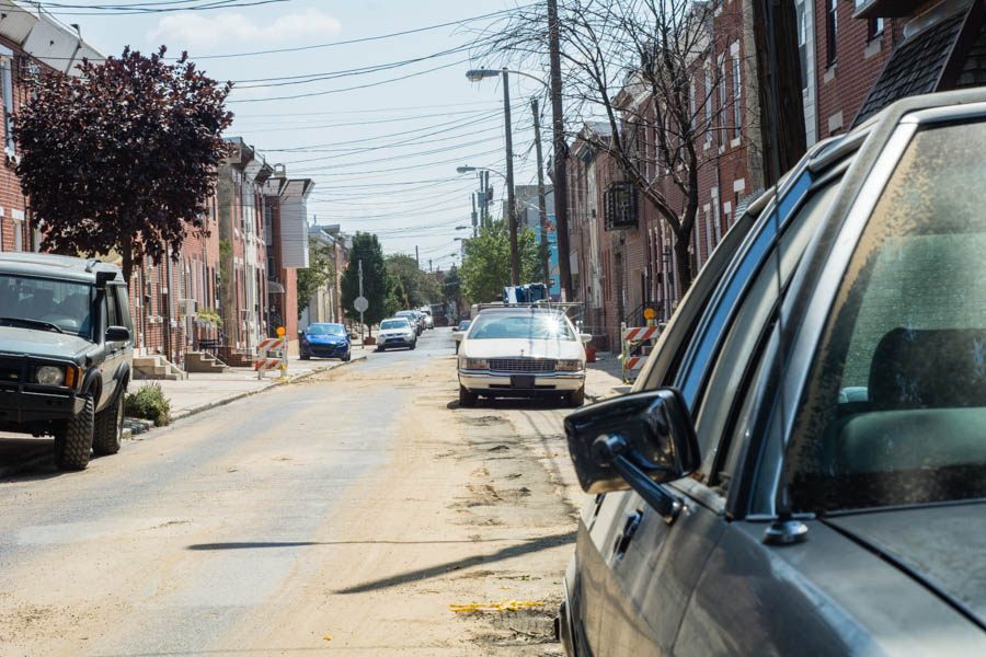 Outside, a Philadelphia Water Department sawhorse sits atop a ditch PWD filled in mid-August. The street remains unpaved, covered in dirt, cars and trucks kicking up dust storms in their wake. Water continues to leak, lightly, along the eastern half of the street, along the sidewalk.